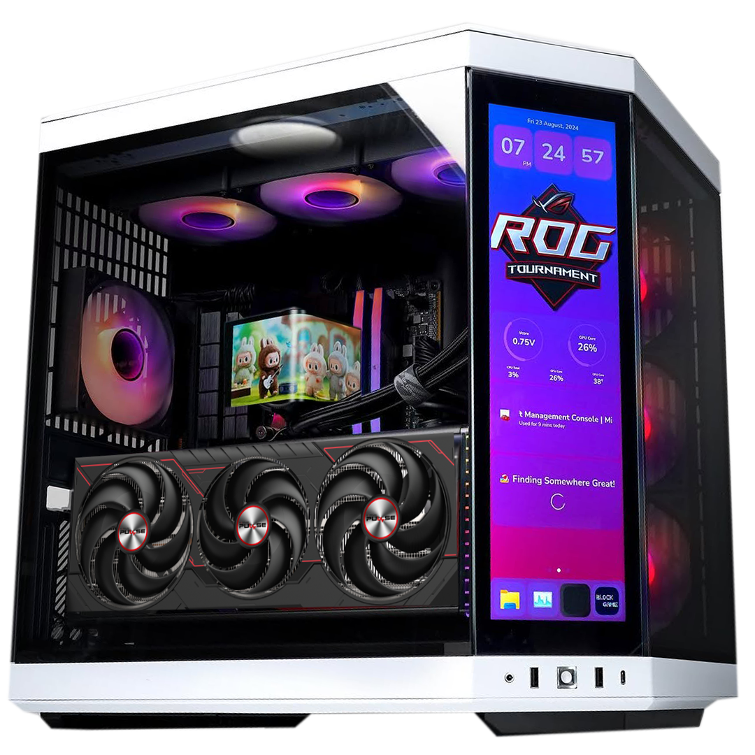 Experience the pinnacle of gaming and content creation with this meticulously crafted AMD-powered PC, designed for uncompromising performance and stunning visuals. At its core lies the AMD Ryzen 9 9950X, a 16-core, 32-thread processor, delivering exceptional processing power for demanding tasks and immersive gaming experiences. Immerse yourself in breathtaking visuals with the SAPPHIRE PULSE RX 9070 XT AMD Radeon 16GB graphics card, featuring a robust triple-fan cooling system for optimal performance and smooth gameplay. The ASUS ROG STRIX B850-E GAMING WIFI motherboard provides a cutting-edge foundation, offering PCIe 5.0 support, Wi-Fi connectivity, and AM5 compatibility for seamless performance and future-proof expandability. 64GB (2x32GB) of T-FORCE DELTA RGB 6000MHz DDR5 memory ensures lightning-fast speeds, eliminating bottlenecks and enabling smooth multitasking. Store your expansive game library and media collection with blazing-fast speeds on the Samsung 990 PRO 2TB PCIe 4.0 NVMe M.2 SSD. Keep your CPU running cool and visually stunning with the TRYX PANORAMA 360 ARGB Liquid Cooler, featuring a curved AMOLED display for personalized aesthetics and real-time system monitoring. Powering this beast is the reliable DeepCool PN1000D 80 Plus Gold power supply, delivering stable and efficient power for demanding components. All components are housed in the revolutionary HYTE Y70 TOUCH Infinite Case, featuring a stunning 14.5" display panel and a dual-chamber chassis for optimal airflow and cable management. Enhance your build with the included Lian Li UNI FAN SL Wireless 120, Lian Li UNI FAN TL Wireless LCD 120, and Lian Li STRIMER Wireless 16-12 & 24-pin RGB cables, adding a touch of personalized flair and stunning RGB lighting. This high-performance PC delivers an exceptional experience for both gaming and content creation, combining cutting-edge technology with premium components and stunning visuals. The Y70 Touch case adds an interactive element with its built in screen.