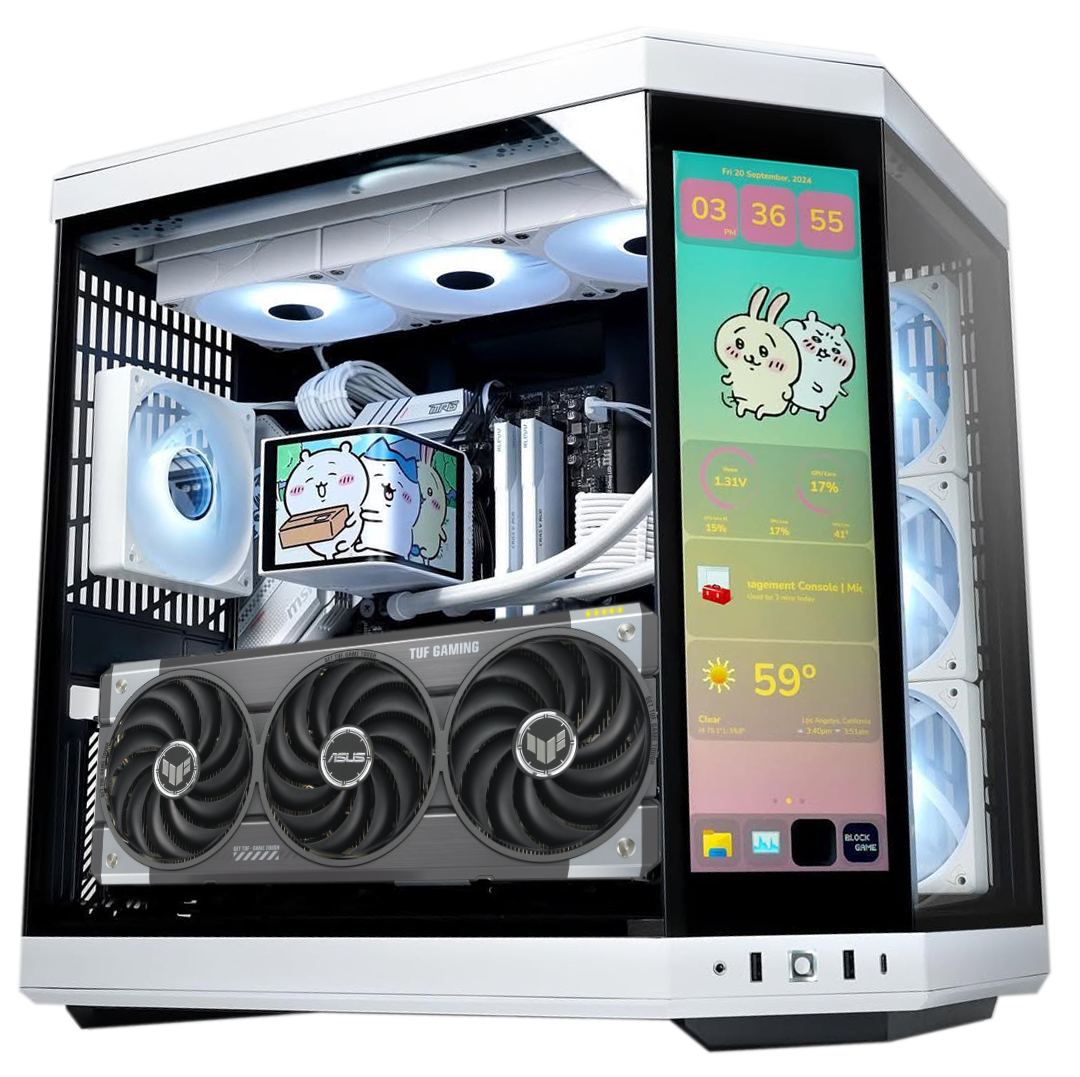Experience the absolute pinnacle of gaming and content creation with this meticulously assembled AMD-powered PC. Designed for the most demanding users, this system delivers unparalleled processing power and breathtaking visuals. At its core lies the AMD Ryzen 9 9950X3D, a 16-core, 32-thread processor, delivering exceptional performance for gaming, rendering, and content creation Witness unparalleled visual fidelity with the ASUS TUF GAMING 5090 32GB OC Edition graphics card, featuring the GT III cooling system and Aura Sync compatibility. The ASUS ROG CROSSHAIR X870E HERO motherboard provides a cutting-edge foundation, offering Wi-Fi 7 connectivity, PCIe 5.0 support, and AI-enhanced features for seamless performance and future-proof expandability. 64GB (2x32GB) of GSKILL 6000MHz CL30 AMD EXPO RAM ensures lightning-fast speeds and smooth multitasking. 3 Store your massive game library and media collection with blazing-fast speeds on the WD 8TB Black SN850X Gen4 NVMe SSD. Keep your CPU running cool and visually stunning with the TRYX PANORAMA 360 ARGB Liquid Cooler, featuring a curved AMOLED display for personalized aesthetics and real-time system monitoring. Powering this beast is the ultra-reliable ASUS ROG THOR 1600W Titanium power supply, delivering stable and efficient power for the most demanding components. All components are housed in the revolutionary HYTE Y70 LCD Gaming Case, offering a stunning panoramic view and excellent airflow. Enhance your build with the included Lian Li UNI FAN SL Wireless 120 3-Pack, Lian Li UNI FAN TL LCD 120 RGB Single Fan, Lian Li STRIMER Wireless 16-12 RGB cable, and Lian Li STRIMER Wireless 24-pin RGB cable, adding a touch of personalized flair and stunning RGB lighting. This high-performance PC delivers an unparalleled experience for both gaming and content creation, combining cutting-edge technology with premium components and stunning visuals