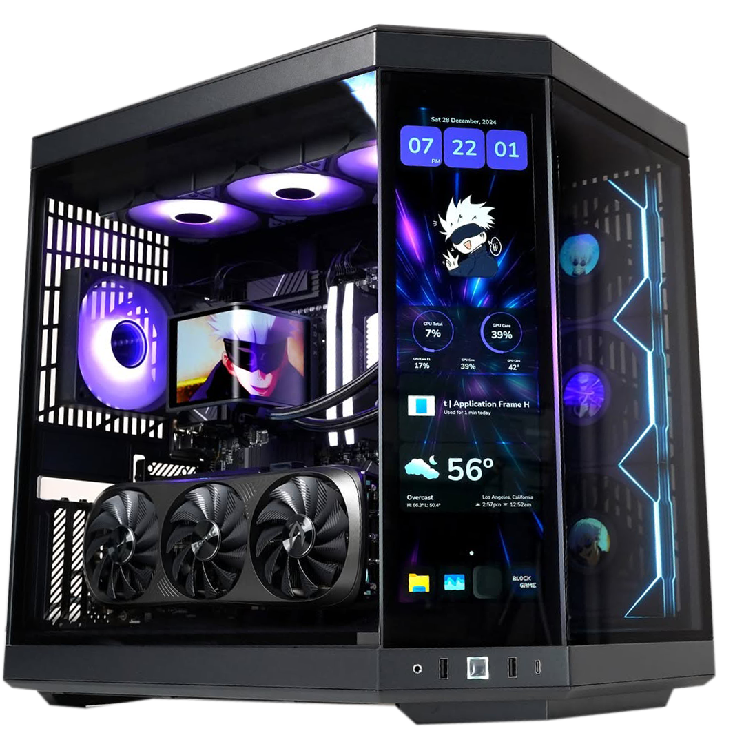 Dominate the digital realm with the Nanotech High-End Gaming PC, a meticulously crafted system designed for the ultimate gaming experience. At its core lies the Intel Core Ultra 9 285K processor, boasting 36MB of cache and speeds up to 5.70GHz, delivering exceptional processing power for demanding games and applications. Immerse yourself in breathtaking visuals with the ASUS PRIME RTX 5080 16GB GDDR7 OC Edition graphics card, featuring a robust triple-fan cooling system for optimal performance and smooth gameplay. The ASUS ROG STRIX Z890-E GAMING WIFI motherboard provides a cutting-edge foundation, offering Wi-Fi 7 connectivity, DDR5 support, and advanced features for seamless performance and future-proof expandability. 32GB (2x16GB) of GSKILL Trident Z5 RGB 7200MHz DDR5 RAM ensures lightning-fast memory speeds, eliminating bottlenecks and enabling smooth multitasking. Store your entire game library and media collection with blazing-fast speeds on the Samsung 990 PRO 2TB PCIe 4.0 NVMe M.2 SSD. Keep your system running cool and visually stunning with the TRYX PANORAMA 360 ARGB Liquid Cooler, featuring a curved AMOLED display for personalized aesthetics and real-time system monitoring. Powering this beast is the reliable MSI MPG A1000GL PCIe5 1000W 80 Plus Gold power supply, delivering stable and efficient power. All components are housed in the revolutionary HYTE Y70 TOUCH Infinite Case, featuring a stunning 14.5" display panel and a dual-chamber chassis for optimal airflow and cable management. Enhance your build with the included Lian Li UNI FAN TL Wireless LCD 120 ARGB 3 Pack and Single Fan, adding a touch of personalized flair and stunning LCD-equipped RGB lighting. This high-end gaming PC delivers an exceptional gaming experience, combining cutting-edge technology with stunning aesthetics and unparalleled performance