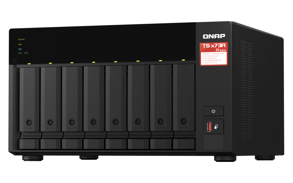 Featuring an AMD Ryzen V1000 series V1500B quad-core processor that delivers great system performance with up to quad-core / 8 threads and Turbo Core up to 2.2 GHz. The TS-873A features two 2.5GbE RJ45 ports and two PCIe Gen 3 slots for you to flexibly deploy 5GbE/10GbE networks. Two M.2 NVMe SSD slots for Qtier Technology and SSD Caching enable constant storage optimization. The TS-873A supports QTS and QuTS hero, allowing users to flexibly switch operating system based on their requirements.