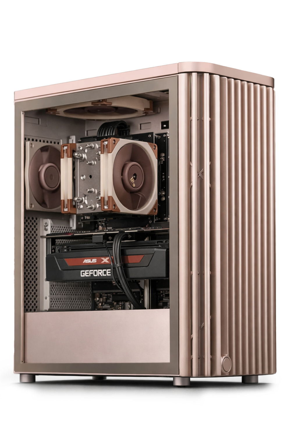 Chassis & Aesthetics The ASUS ProArt PA401 Wood Edition case serves as the perfect shell for this build. Featuring open-pore wood accents and a clean beige finish, it includes high-airflow 160mm fans that move large volumes of air at low RPMs. The tempered glass side panel allows a clear view of the color-coordinated Noctua components and the white memory.